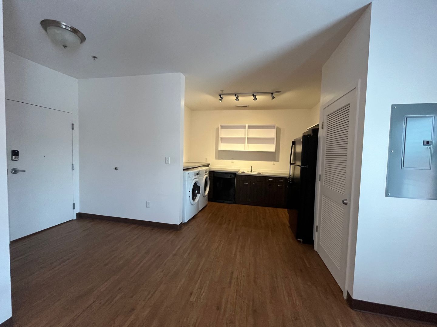 • Open kitchen with black appliances (fridge, microwave, stove, dishwasher)